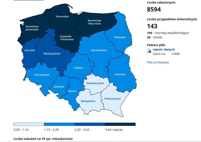 Z powodu COVID-19 zmarło 39 osób, natomiast z powodu współistnienia COVID-19 z innymi schorzeniami zmarły 104 osoby.