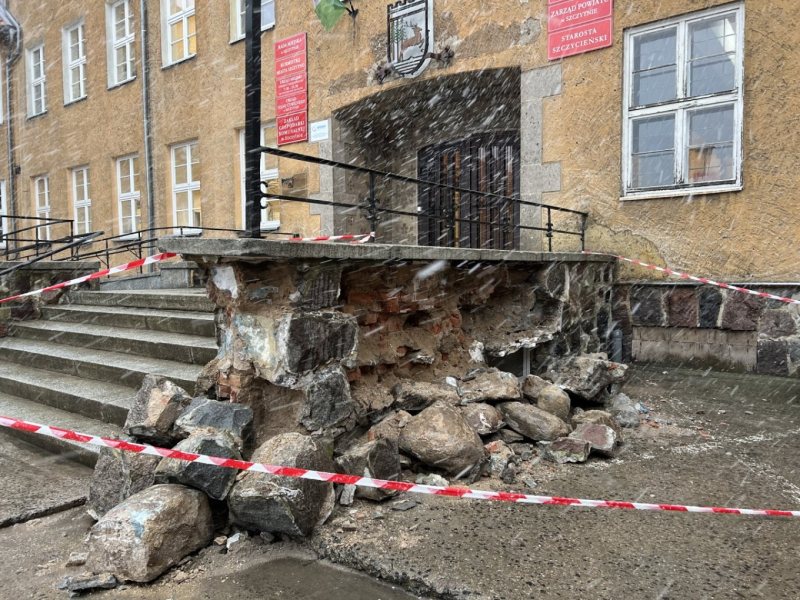 - Podejrzewamy, że mur z kamieni został uszkodzony przez mróz, dostała się tam woda i kamienie rozsadziło – mówi Piotr Paszkiewicz. - Miejsce jest zabezpieczone, schody wejściowe do urzędu są bezpieczne. Można z nich korzystać – zapewnia.