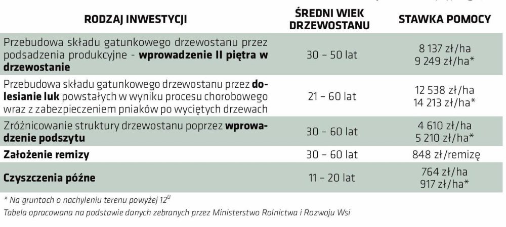 Zakres uzyskiwanych kwot w ramach powyższego dotyczy jednorazowych wypłat z tytułu poniesionych kosztów realizacji poszczególnych inwestycji, dostosowanych do wieku drzewostanu, i kształtuje się następująco: