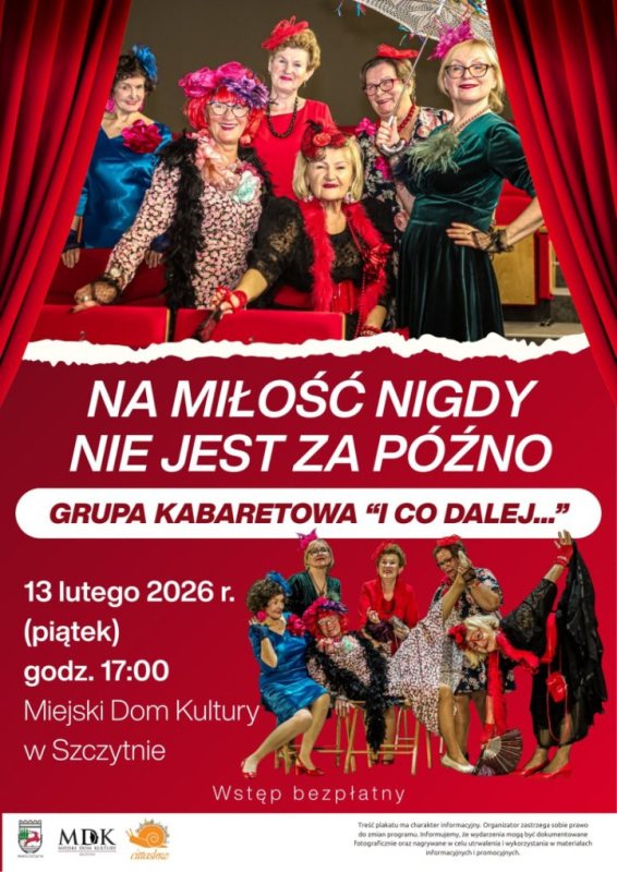 Scena, światła i kilka historii, które wielu widzów zna z własnego życia. 13 lutego o godz. 17.00 w Miejskim Domu Kultury w Szczytnie wystąpi grupa kabaretowa „I co dalej…”. Spektakl pod hasłem „Na miłość nigdy nie jest za późno” będzie otwarty dla publiczności – wstęp jest bezpłatny.