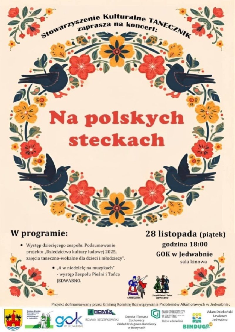 W piątek, 28 listopada, o godz. 18:00 w GOK w Jedwabnie odbędzie się koncert „Na polskich steckach”. W programie wystąpią młodzi tancerze oraz Zespół Pieśni i Tańca Jedwabno.