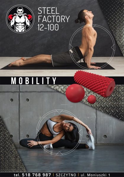 Mobility – zajęcia, na których skupiamy się na rozciąganiu i niwelowaniu napięć wywołanych stresem, czy nieprawidłową pozycją naszego ciała w życiu codziennym. Używamy technik automasażu za pomocą rollera, piłek, rurek pcv, czy rozciągania z gumą.