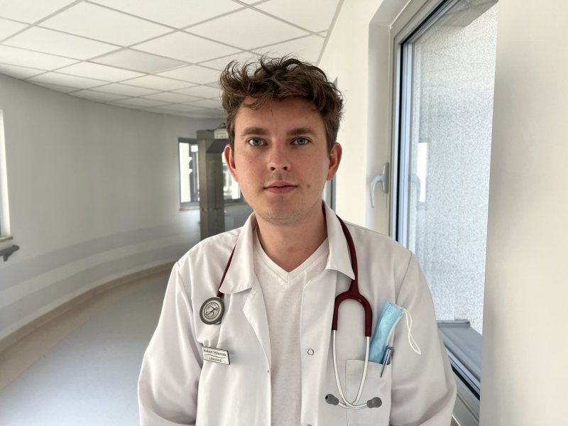 Na pierwszy ogień poszedł Hubert Mikosza (26 l.). To jeden z najmłodszych lekarzy stażystów w naszym szpitalu. Pan Hubert to mieszkaniec Szczytna. Medycynę skończył w czerwcu 2021 roku w Tarnopolu w Ukrainie. We wrześniu w Białymstoku zdał egzamin nostryfikujący jego uprawnienia do wykonywania zawodu lekarza w Polsce.