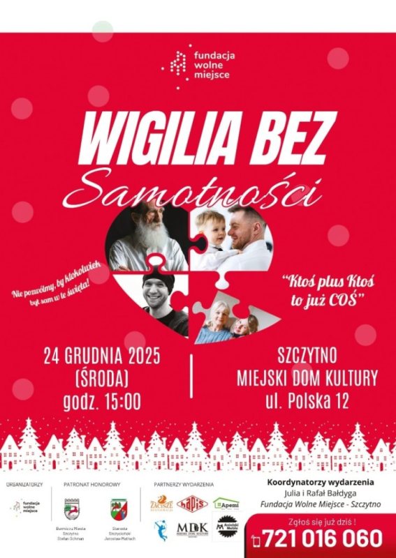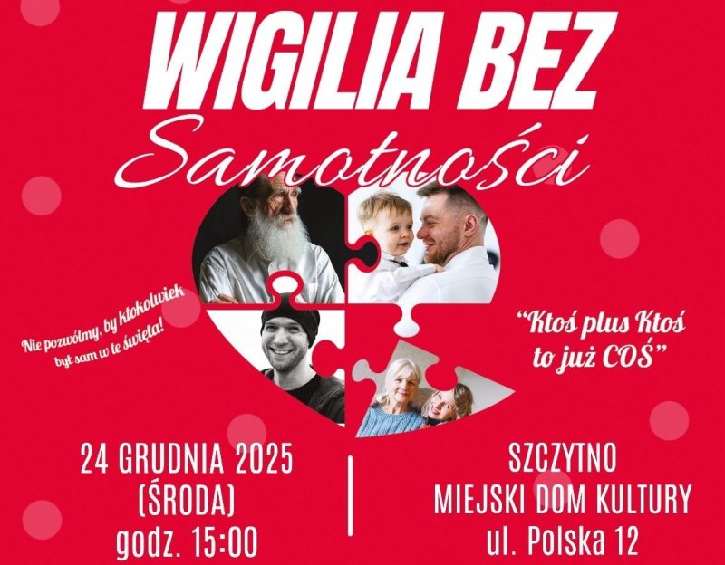 W Szczytnie po raz pierwszy odbędzie się wydarzenie, które w innych miastach od lat zmienia samotność w bliskość. Wolontariusze Fundacji Wolne Miejsce – Szczytno zapraszają wszystkich mieszkańców na „Wigilię bez samotności”, spotkanie otwarte dla każdego, kto 24 grudnia chciałby usiąść do wspólnego stołu, porozmawiać i poczuć, że święta naprawdę są dla ludzi.