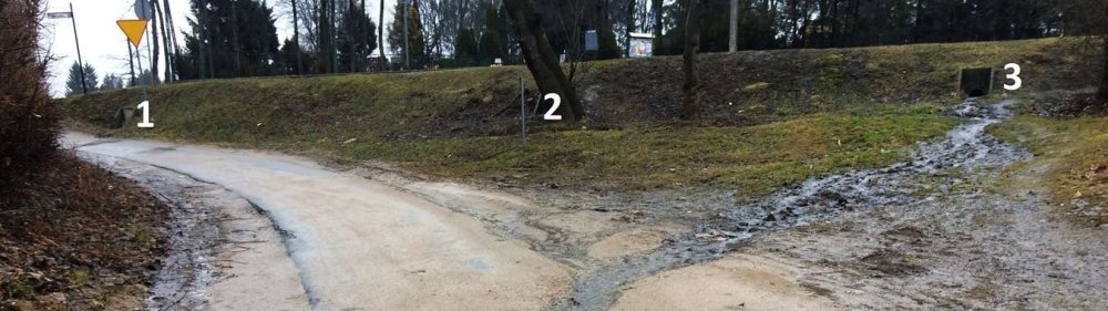 1, 2, 3 – oznaczenia wylotów przykanalików z których następuje spływ wód na ulicę Sybiraków