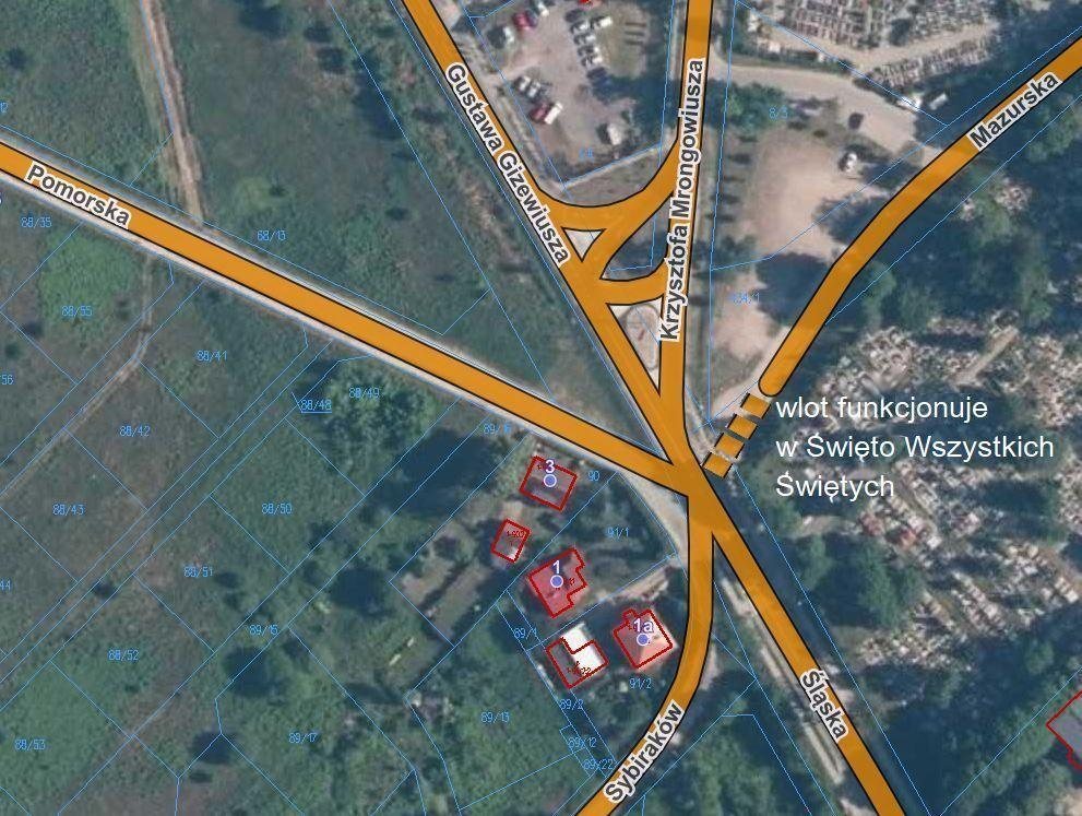 Fot. Obecny stan skrzyżowania DK 57 z ulicami: Pomorską, Sybiraków, Mrongowiusza (DW 600), Mazurską.