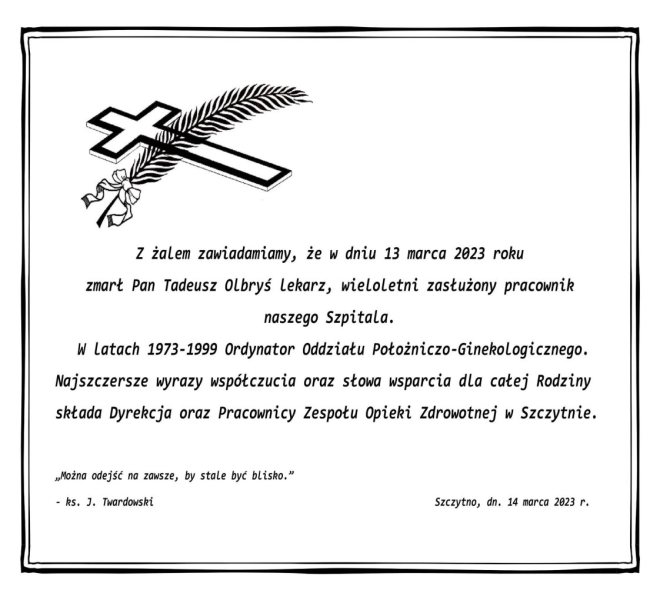 W poniedziałek, 13 marca, zmarł doktor Tadeusz Olbryś, w latach 1973-1999 ordynator oddziału położniczo-ginekologicznego w szczycieńskim szpitalu. Miał 90 lat.