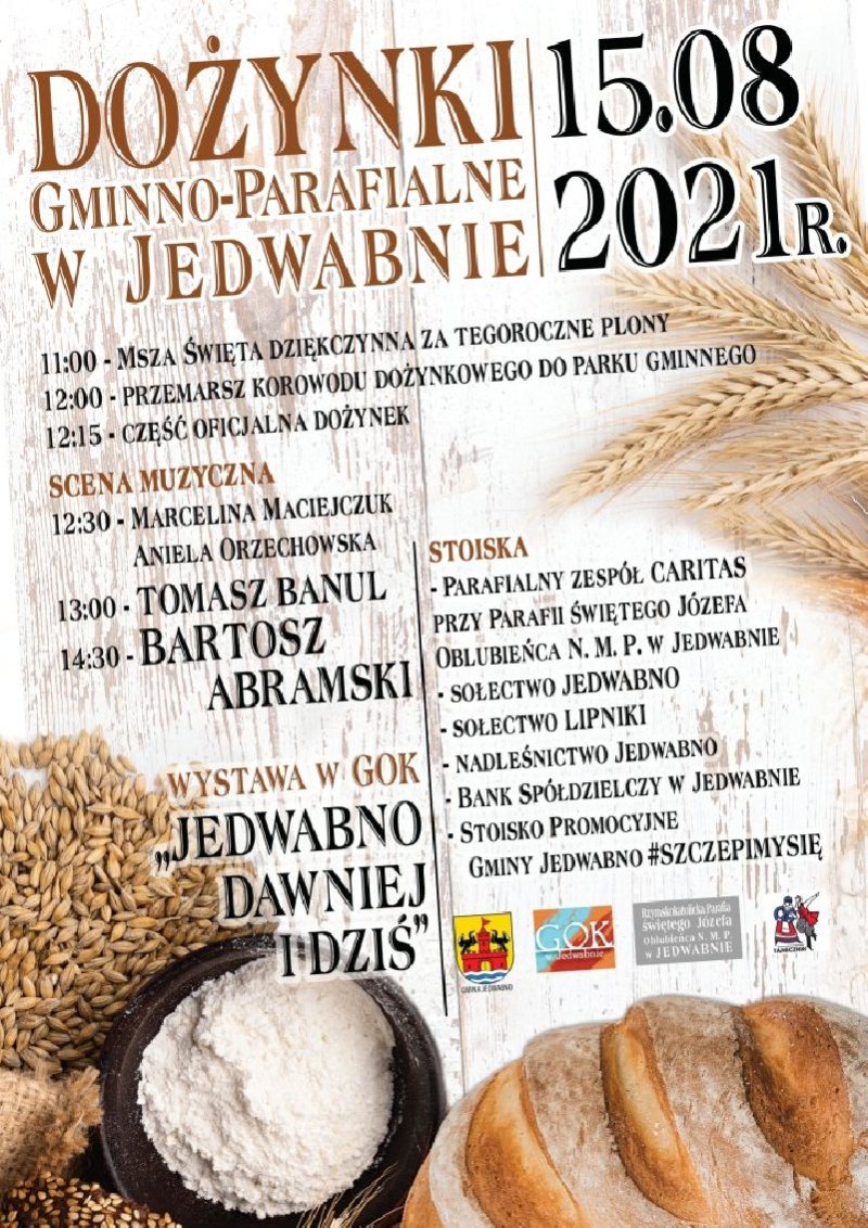Na niedzielę, 15 sierpnia zaplanowano w Jedwabnie Dożynki Gminno-Parafialne. Święto plonów to ukoronowaniem całorocznego trudu rolników, obchodzone po zakończeniu wszystkich najważniejszych prac polowych. Święto w Jedwabnie zapowiada się bardzo atrakcyjnie. Szczegóły wydarzenia na plakacie.