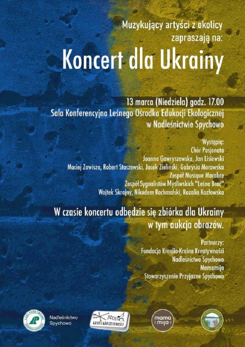 Muzykujący artyści z terenu Nadleśnictwa Spychowo postanowili zorganizować specjalny #KoncertDlaUkrainy. Zagrają już w niedzielę, 13 marca o godz. 17:00 w Leśnym Ośrodku Edukacji Ekologicznej. (Szczegóły na plakacie).
