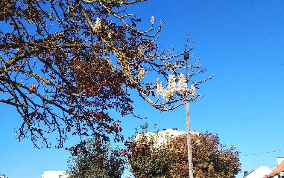 Nietypowe zjawisko zaobserwowała w niedziele pani Bożena ze Szczytna – kwitnące drzewo kasztanowca. - Byłam w szoku, bo o tej porze roku, to już raczej spadające kasztany można zaobserwować, a nie kwiaty na drzewie – mówi.