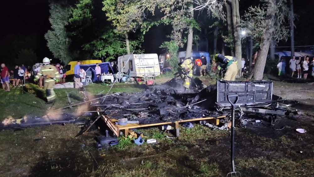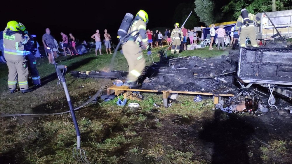 Ogień doszczętnie strawił przyczepę campingową. Druga została nadtopiona od wysokiej temperatury.