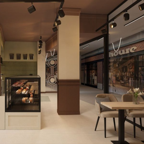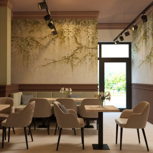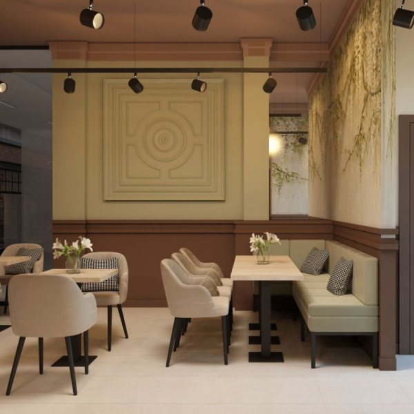 W kawiarni dominuje harmonia barw: neutralne beże, ciemne drewno i subtelna zieleń, tworząc atmosferę elegancji i spokoju.