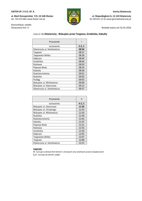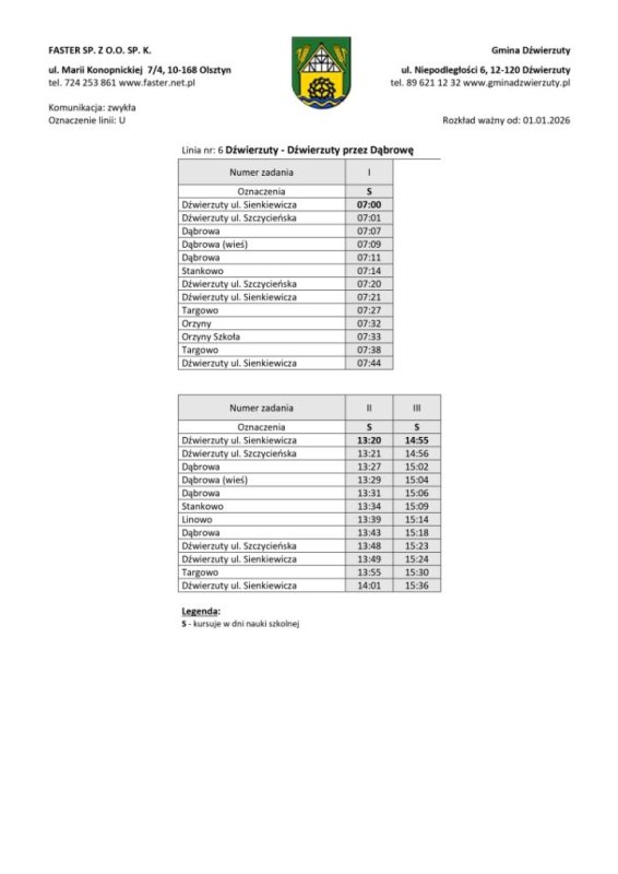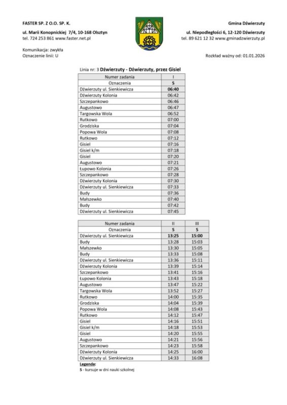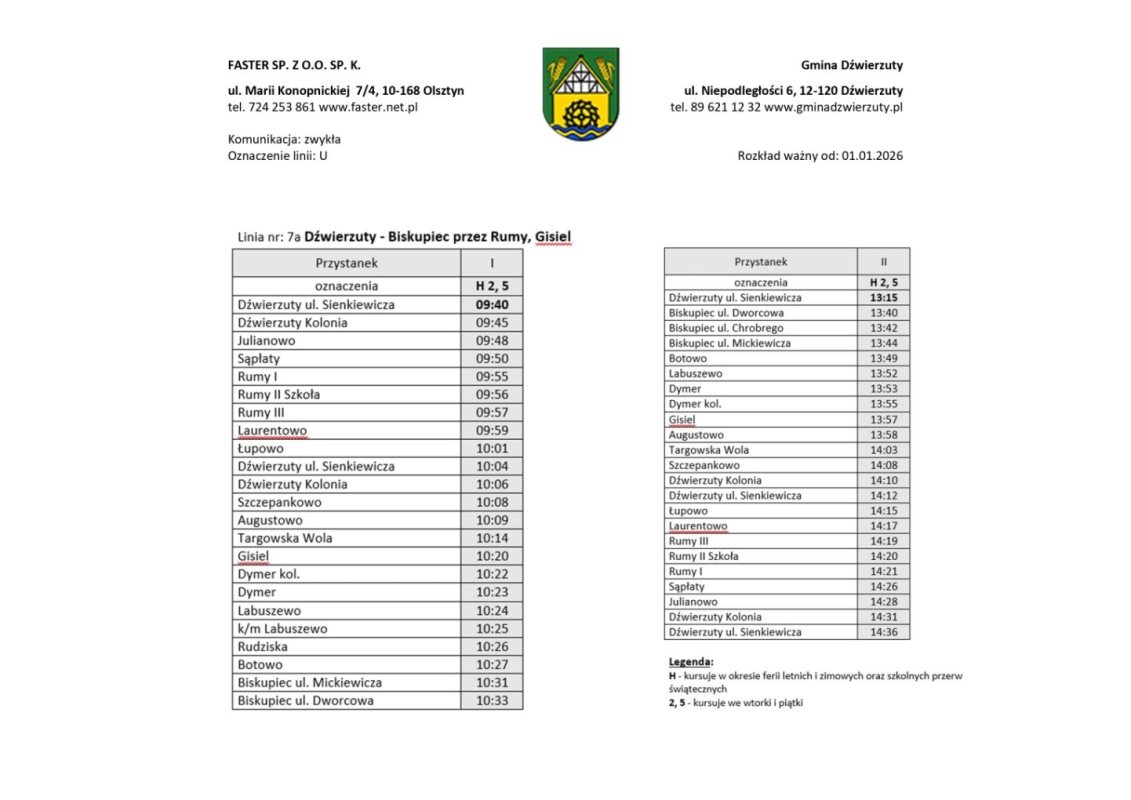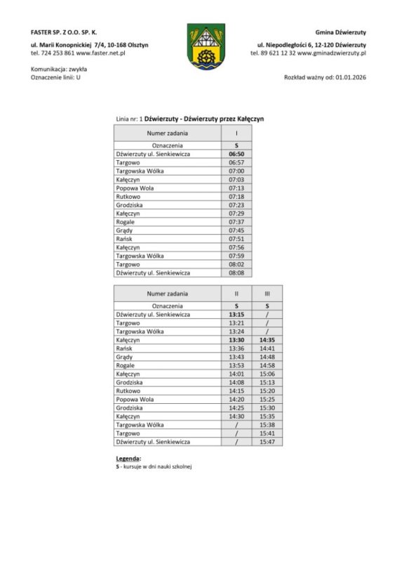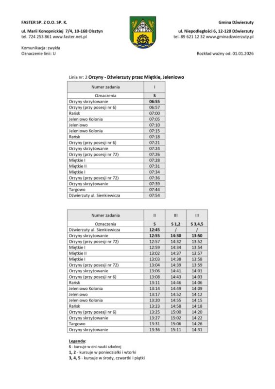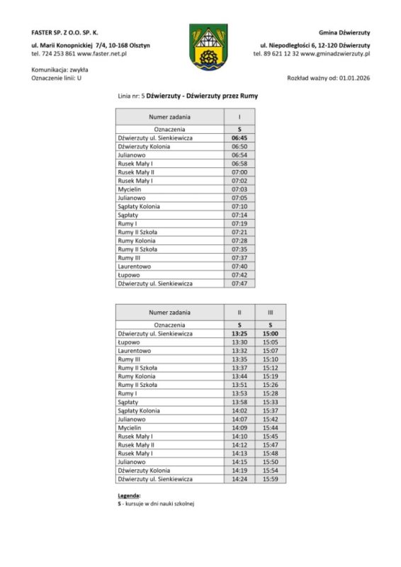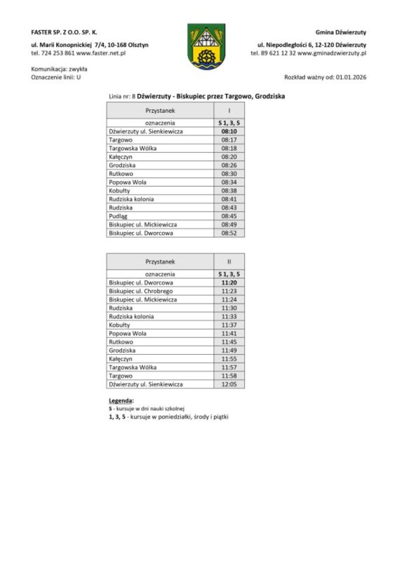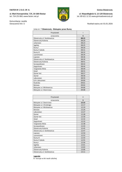 Organizatorem transportu jest gmina Dźwierzuty, a obsługę realizuje przewoźnik zewnętrzny. Rozkłady jazdy zostały ułożone z myślą o uczniach, osobach pracujących i seniorach. Część kursów będzie realizowana w dni nauki szkolnej, inne we wtorki i piątki lub w wybrane dni tygodnia.