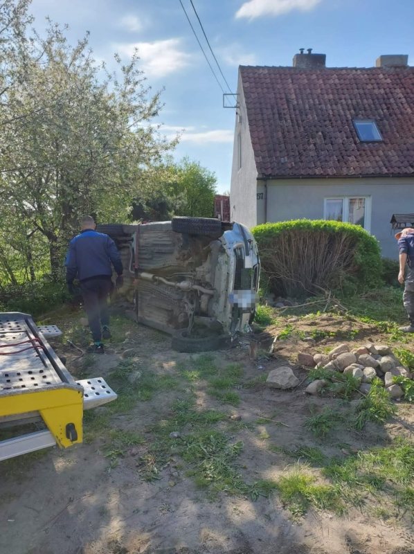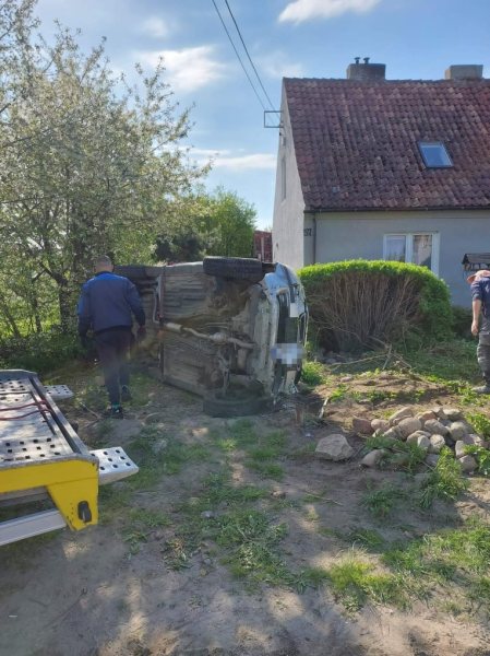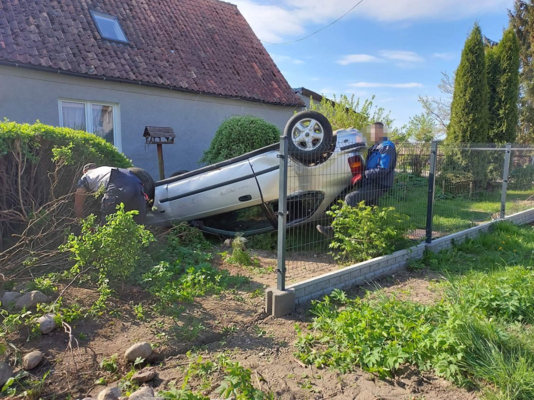 Na ulicy Leśnej w Szczytnie dachowała honda. Auto zniszczyło słupki wjazdowe od bramy, ścięło żywopłot i tuje.
