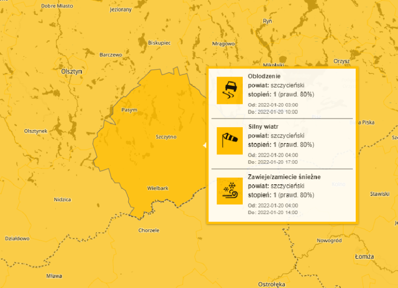 Wydział Centralnego Biura Prognoz Meteorologicznych w Białymstoku wydaje dla powiatu szczycieńskiego następujące ostrzeżenia meteorologiczne.