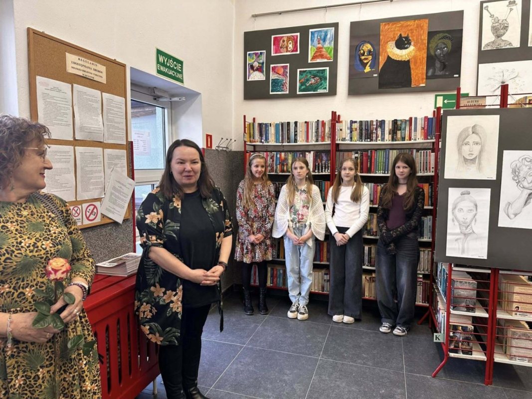 W sali biblioteki pojawiły się obrazy, hafty i prace wykonane różnymi technikami. Autorkami były młode uczestniczki zajęć prowadzonych przez Olgę Kokoryn. Obok nich swoje prace pokazała także Jadwiga Karczmarczyk. Jej hafty przyciągały uwagę detalem i precyzją wykonania. To właśnie ta technika stała się jednym z mocniejszych punktów wystawy.