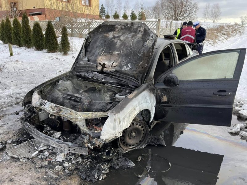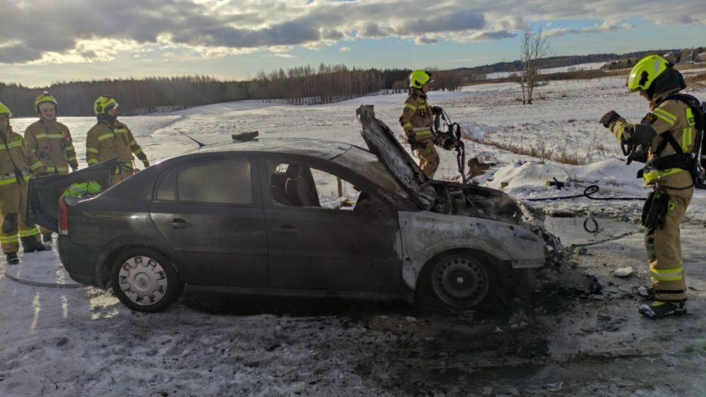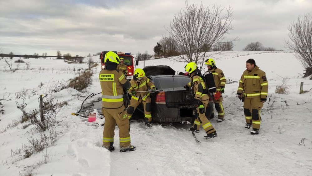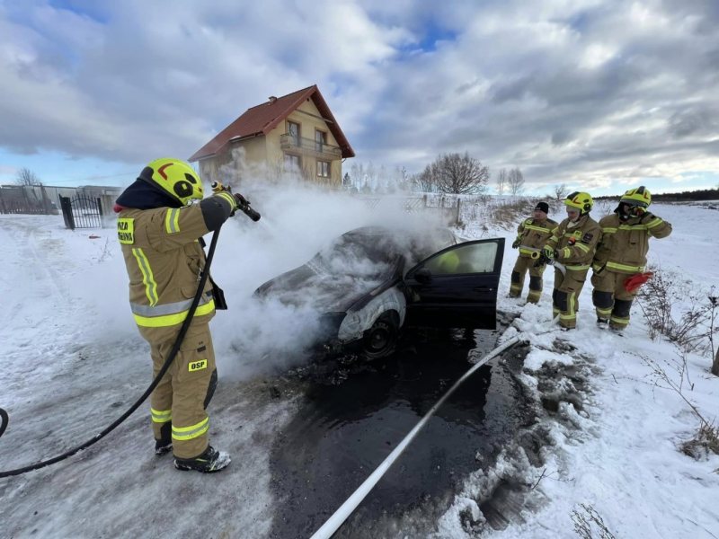 Dwunastu strażaków gasiło opla vectrę, który zapalił się przy jednej z posesji w Burdągu. Ogniem objęta była komora silnika oraz przedział osobowy pojazdu.