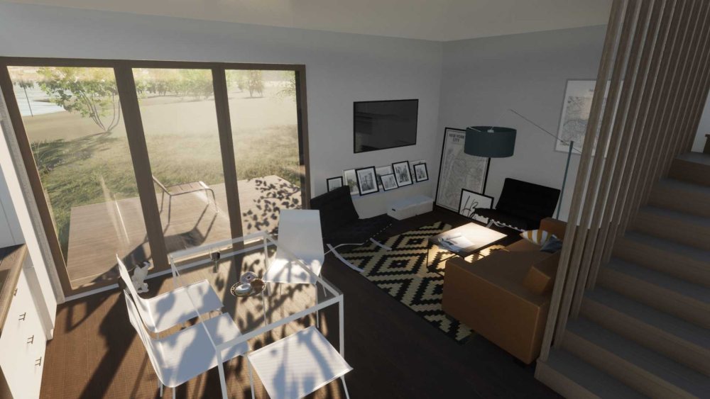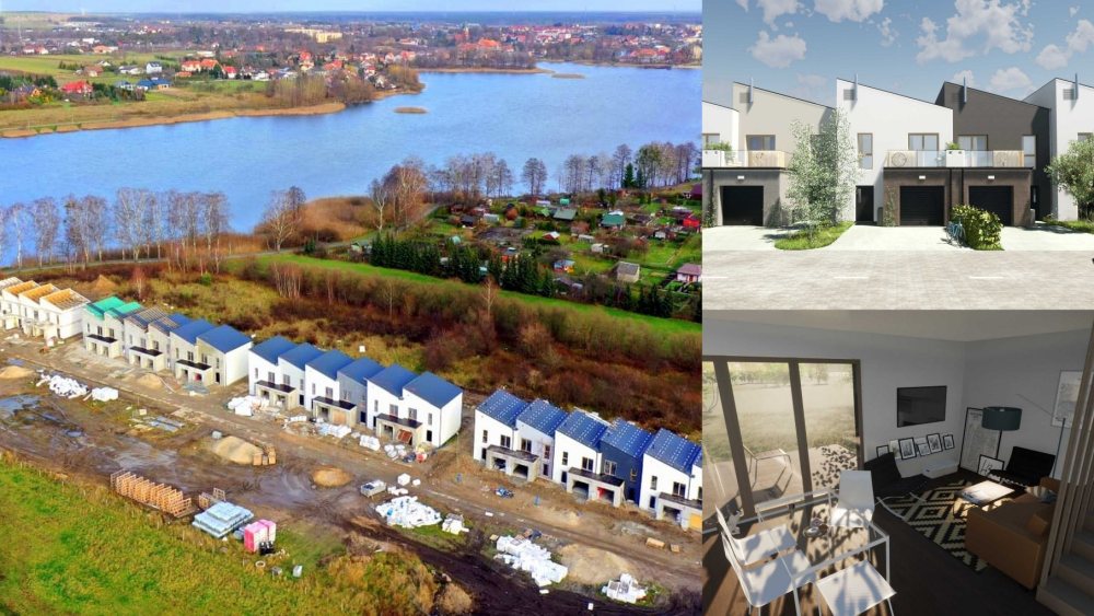 W sprzedaży dostępnych jest 12 nowych budynków o powierzchni około 100 metrów kwadratowych (garaż, na dole salon z kuchnią, na górze 4 sypialnie). Wszystko można samemu aranżować według uznania. To domy bezemisyjne bez dymu i zanieczyszczeń na działce pełnej zieleni i tuż przy jeziorze.