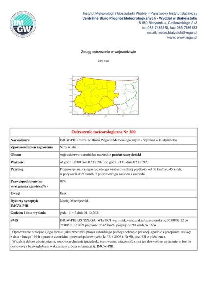 Od godz. 5:00 do godz 21:00 w dniu 2 grudnia prognozuje się wystąpienie silnego wiatru o średniej prędkości od 30 km/h do 45 km/h, w porywach do około 90 km/h – ostrzega Rządowe Centrum Bezpieczeństwa.