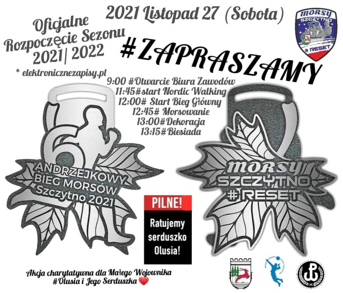 W sobotę, 27 listopada odbędzie się 6 Andrzejkowy Bieg Morsa, to też Oficjalne Rozpoczęcie Sezonu Morsowego 2021/22 w naszym mieście. Wydarzenie organizują oczywiście Morsy Reset Szczytno. Będzie ono połączone ze zbiórką funduszy na rzecz ratowania życia Olusia z Piwnic Wielkich.