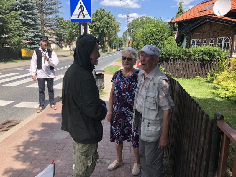 Po drodze spotykamy oczywiście ludzi. Odtwarzający główną rolę pozdrawia ich i przedstawia się nazwiskiem Wańkowicza. Wywiązują się rozmowy. Jedna z nich z małżeństwem w starszym wieku – trzymającym się za ręce. Małżonkowie przyznają, że wywodzą się z Kresów, ale postać Wańkowicza jest im znana, jak i jego twórczość, głównie ta mazurska.