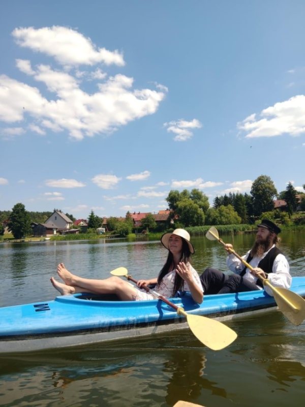 Kiedy docieramy nad jezioro, załoga przygotowuje kajaki i znów - przy dźwięku dęciaków Melchior Wańkowicz wraz z córką Martą wyrusza na spływ – tak jak dokładnie 89 lat temu. Za nimi ruszają uczestnicy. Spływ zakończył się w miejscowości Zgon.