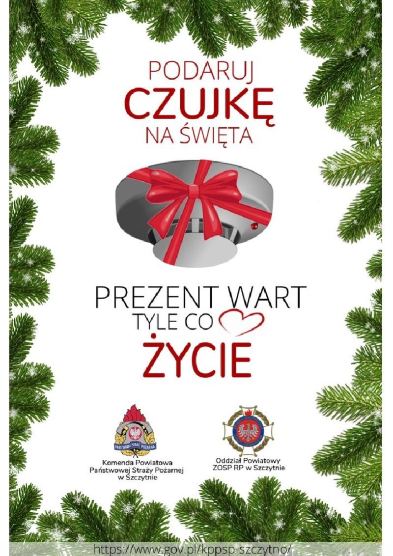 W tym przedświątecznym okresie, strażacy Komendy Powiatowej Państwowej Straży Pożarnej w Szczytnie, wraz z druhami Ochotniczych Straży Pożarnych przygotowali dla mieszkańców naszego rejonu akcję społeczną, proponującą zakup CZUJKI jako świątecznego prezentu dla naszych najbliższych! Niewiele ponad 5 % gospodarstw domowych Polsce jest wyposażonych w urządzenia wykrywające dym i tlenek węgla – to zdecydowanie zbyt mało! Tym bardziej, że te proste narzędzia, które mogą stać się niskobudżetowym prezentem dla naszych bliskich, mogą uratować im życie!