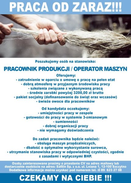 Osoby zainteresowane prosimy o przesłanie CV na adres mailowy lub dostarczenie osobiście na adres: Safilin Sp. z o.o. ul. Lniana 1, 12-100 Szczytno. Dodatkowe informacje można uzyskać pod numerem tel. 89 623 27 08