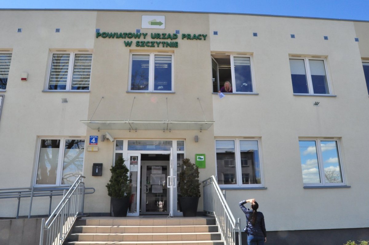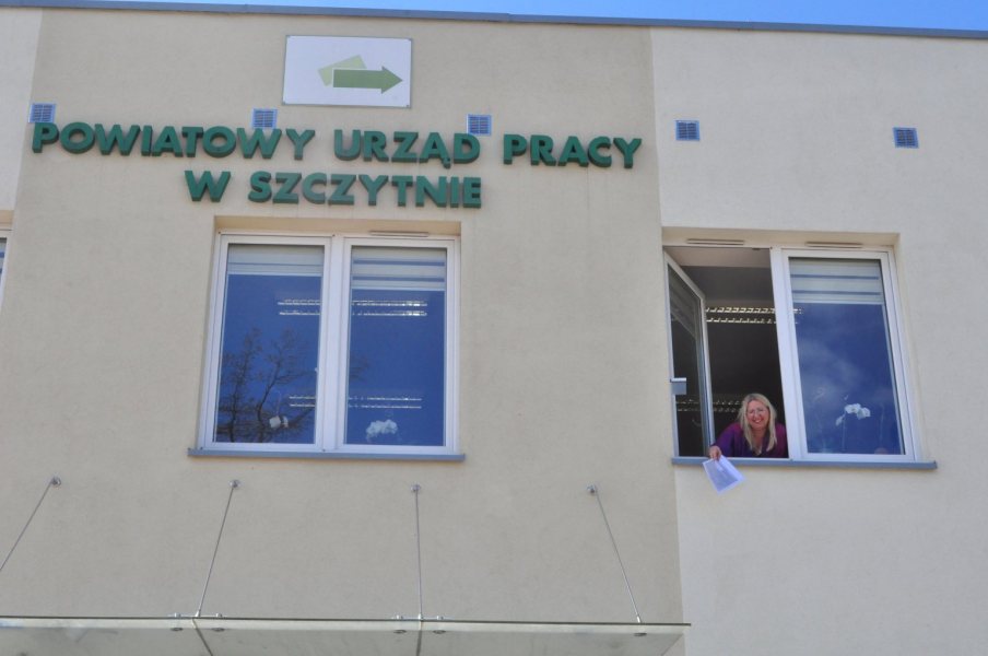 Jak widać na zdjęciu dyrektor Powiatowego Urzędu Pracy Beata Januszczyk ima się najróżniejszych sposobów, by przyspieszyć procedury. Tu – najzwyczajniej – rzutem z okna – przekazuje petentce wymagający uzupełnienia wniosek o wsparcie finansowe.