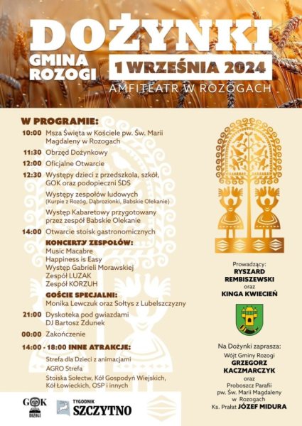 W Rozogach szykuje się wyjątkowe wydarzenie – Dożynki Gminne 2024! Już w niedzielę, 1 września mieszkańcy oraz goście spotkają się, aby wspólnie podziękować rolnikom za ich trud i pracę. Wydarzenie poprowadzi znany wszystkim Ryszard Rembiszewski, czyli popularny „Pan Lotto”, wspierany przez Kingę Kwiecień.