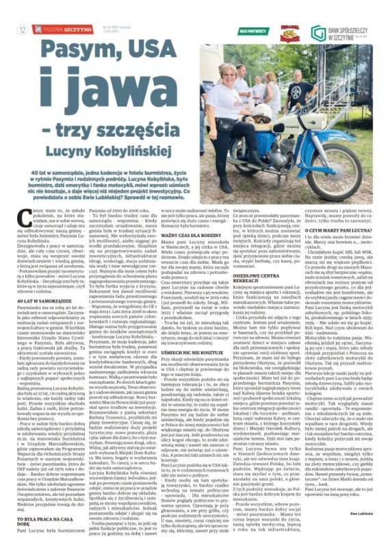 - Wspomnę, że wstąpiliśmy do UE 1 maja 2004 r. Lata 2004-2006 to okres wspierania nowych państw członkowskich i rozwoju regionalnego. Dlatego ważne było przygotowanie gminy do środków zewnętrznych – kontynuuje Lucyna Kobylińska. - Przyznam, że moja kadencja, jako burmistrza była trudna, ponieważ gmina zaciągnęła kredyt w euro i w tym niełatwym okresie dla kredytobiorców bankowych, dług wzrósł dwukrotnie. W przypadku nadmiernego zadłużenia wkracza komisarz. Walką o przetrwanie było oszczędzanie. Po dwóch latach gmina wyszła na prostą. Teraz obserwuję z zadowoleniem, jak nasza gmina powoli się odbudowuje. Nowy burmistrz Marcin Nowociński już pozyskał sporo środków na inwestycje. Rozmawiałam z panią sekretarz Barbarą Trusewicz, przybliżyła mi plany inwestycyjne. Cieszę się, że będzie realizowany duży projekt turystyczny: nowe pomosty, plaża i plac zabaw dla dzieci, bo o tym marzyłam. Powstają nowe drogi, ulice. Widzę, jak aktywny stał się po ostatnich wyborach Miejski Dom Kultury. Ma nowy, bogaty w wydarzenia kalendarz. To cieszy, a w sercu budzi się nuta samorządowca.