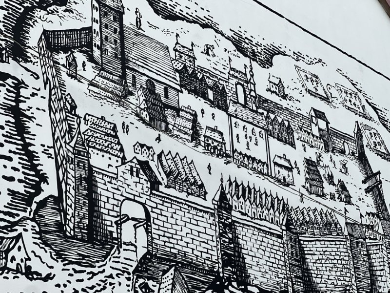 Na muralu widać średniowieczny układ Rynku, kościół św. Barbary i fragmenty murów obronnych. To przypomnienie o tożsamości miejsca, którego historia sięga średniowiecza i budzi zainteresowanie wciąż na nowo.