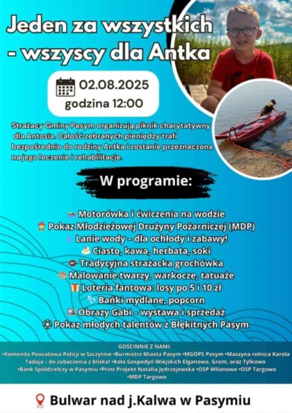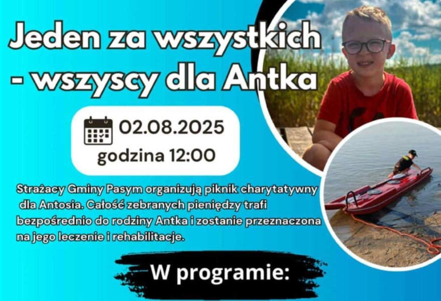 W sobotę 2 sierpnia, punktualnie w południe, bulwar nad jeziorem Kalwa w Pasymiu zamieni się w centrum dobra. To tu strażacy z Gminy Pasym, mieszkańcy, samorządowcy i przyjaciele z różnych stron Mazur zorganizują wielki piknik charytatywny dla Antka – chłopca, który mierzy się z trudną walką o zdrowie.