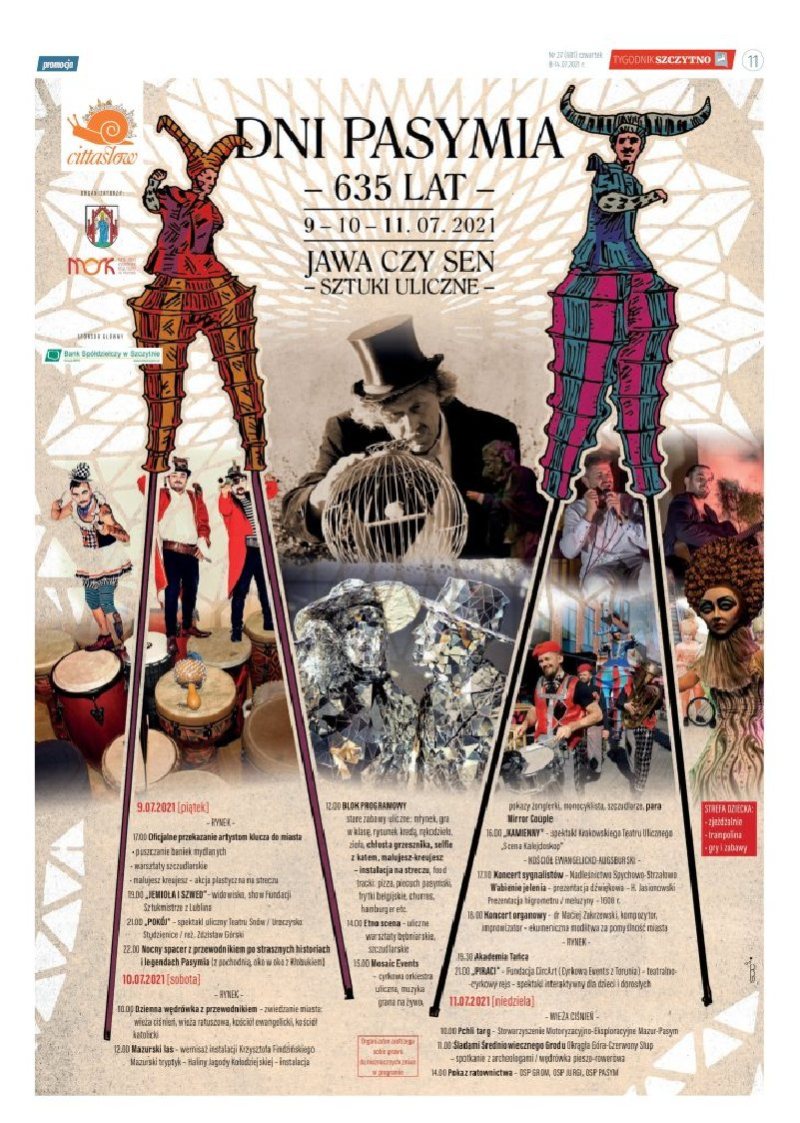 Po drugie – w programie brak jest standardu, charakterystycznego dla większości podobnych wydarzeń. Ów standard to wielka scena, z której przez kilka godzin dobywają się najróżniejsze dźwięki najróżniejszych gwiazd i gwiazdeczek, a wokół – siedzi bądź stoi w ścisku podrygujący tłum. Całości pasymskiej imprezy nadano tytuł „Jawa czy sen”, co ma znamionować to, że niektóre a może i wszystkie główniejsze) wydarzenia mają z podświadomości mieszkańców uwolnić to, co tam ukryte, pokazać, że dobrze znane miejsce, które np. codziennie mija się w drodze do pracy i nie zwraca nań uwagi, wcale nie jest tak dobrze znane i ma w sobie tajemną moc...