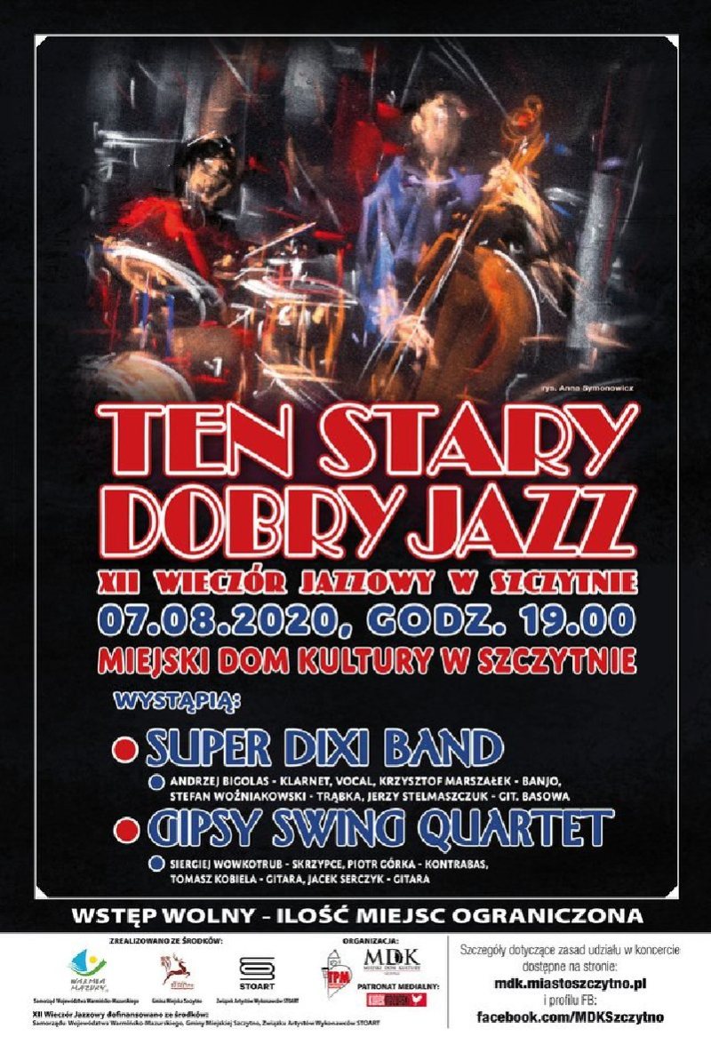 W piątek, 7 sierpnia w miejskim Domu Kultury w Szczytnie odbędzie się koncert z cyklu: TEN STARY DOBRY JAZZ - XII Wieczór Jazzowy w Szczytnie. Początek godzina 19:00. Wstęp wolny. Ilość miejsc ograniczona. Wystąpią dwa zespoły muzyczne grające tradycyjną odmianę muzyki jazzowej.