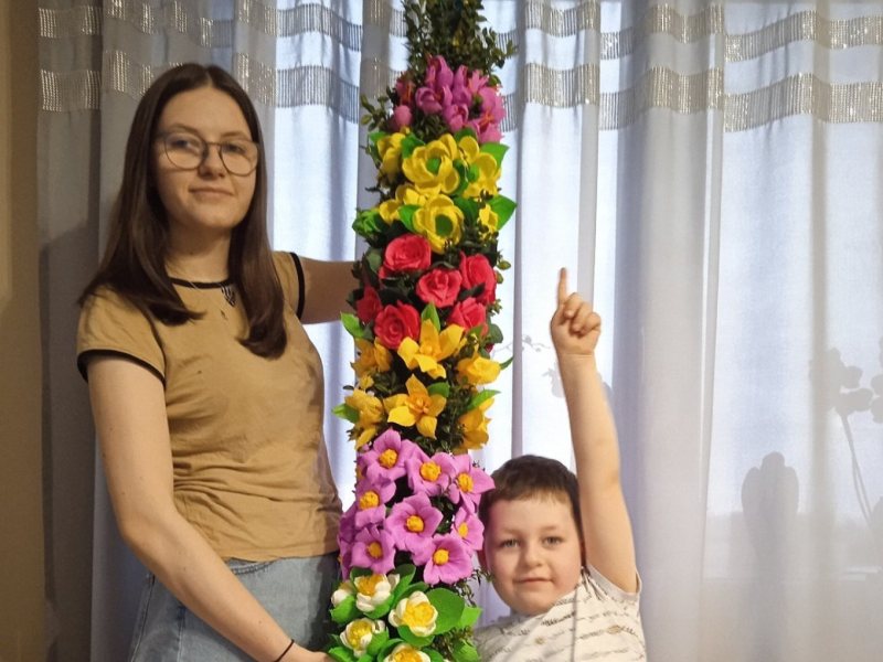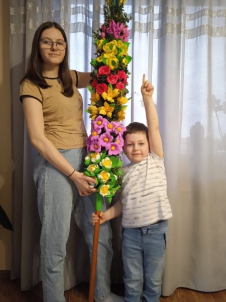 W tym roku pielgrzymi przekazali w darze palmę wielkanocną, która wykonała Edyta Samsel z Orzeszek. Na zdjęciu dzieci pani Edyty: Justyna i Michał