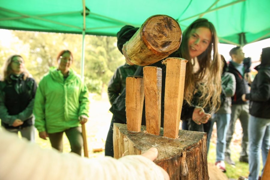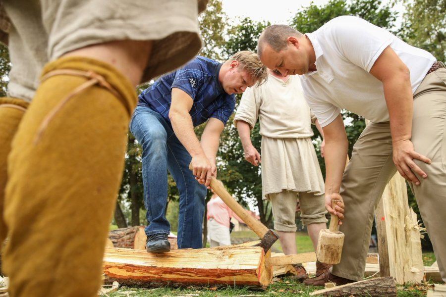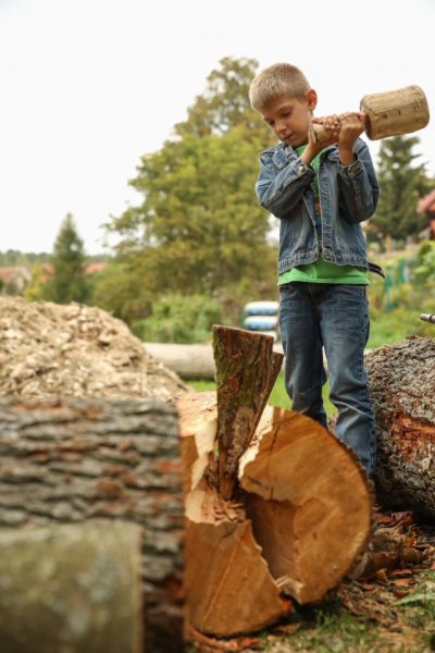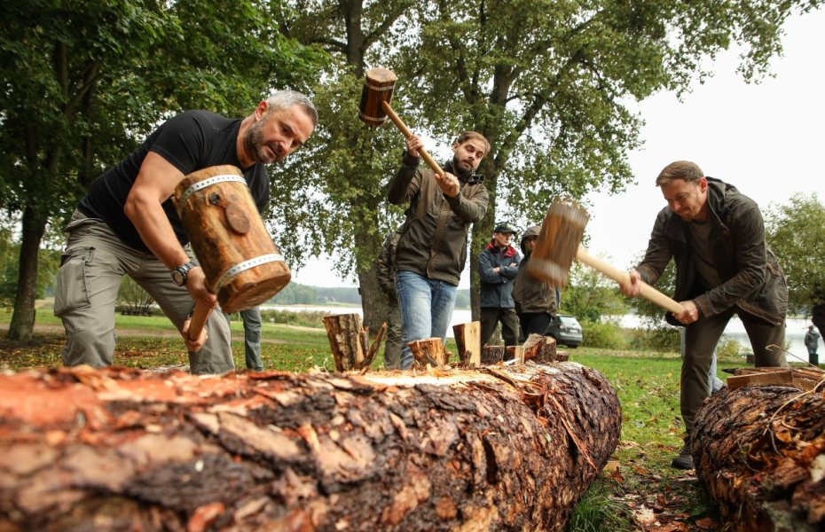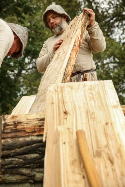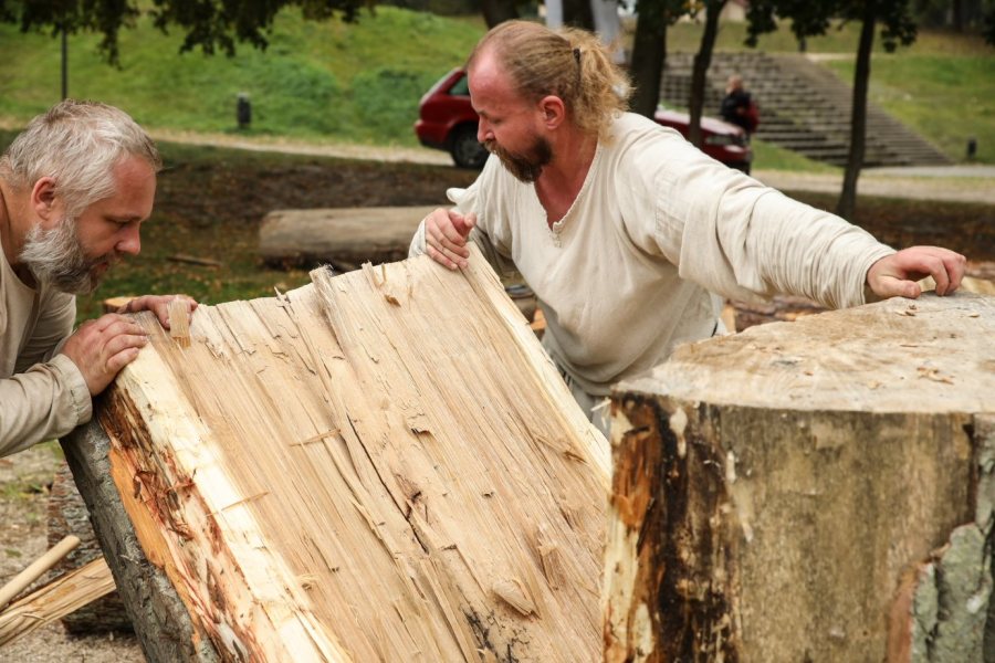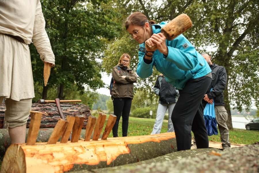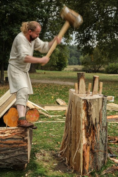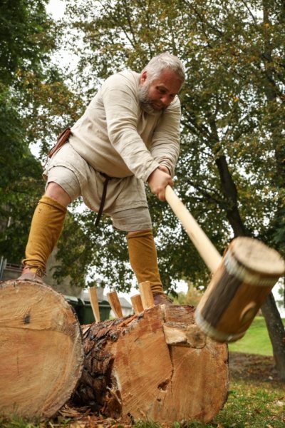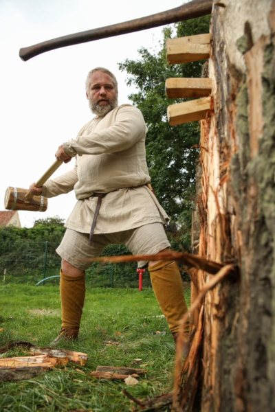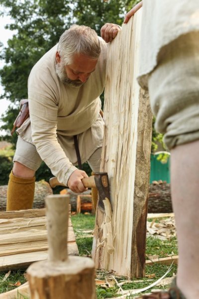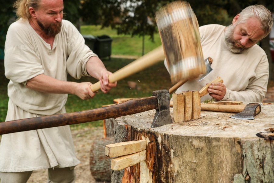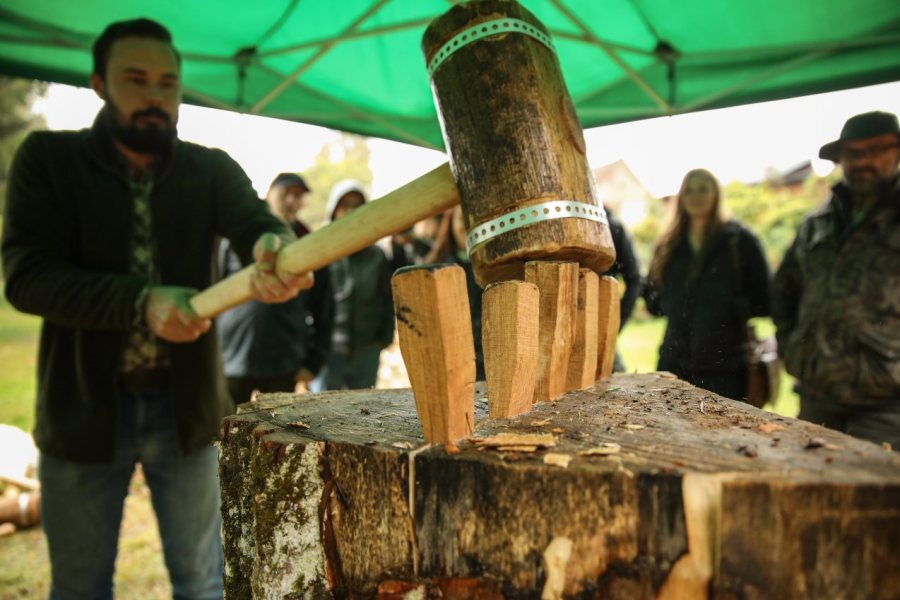 Jak się okazało, nie jest to wcale prosta sprawa, jak przy rąbaniu siekierą krótkiego wałka do pieca. Mogli się o tym przekonać uczestnicy warsztatów i wszyscy odwiedzający, którzy spróbowali swoich sił z dębowymi młotami w rękach. Trzeba było umiejętnie dobierać kliny, pobijać je w odpowiednich miejscach i kolejności, aby drewno rwało się w pożądanym kierunku. Do dyspozycji uczestników były kłody różnych gatunków drzew, takich jak olsza, sosna, topola i buk, aby sprawdzić, jakie drewno jest do tego celu najlepsze.