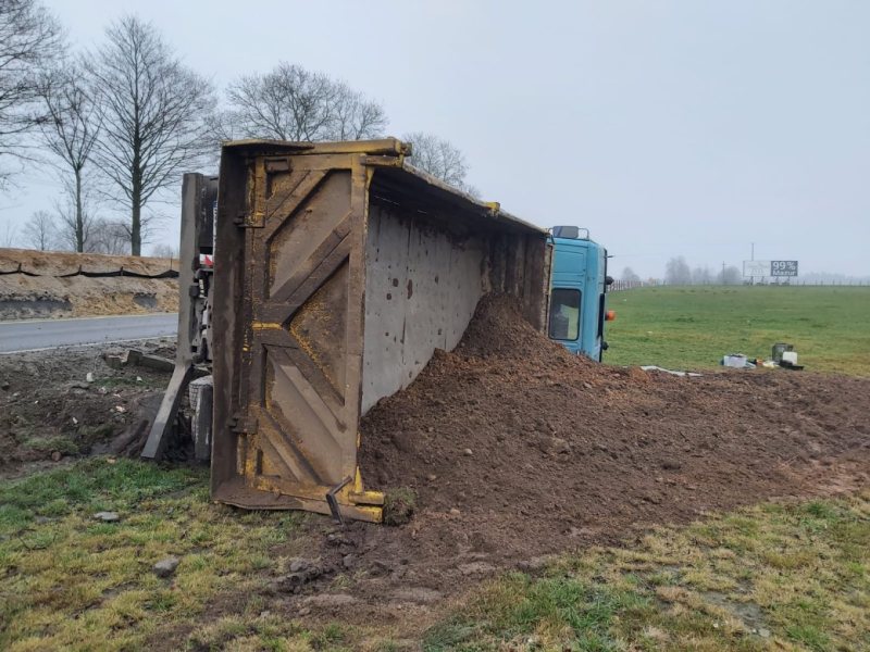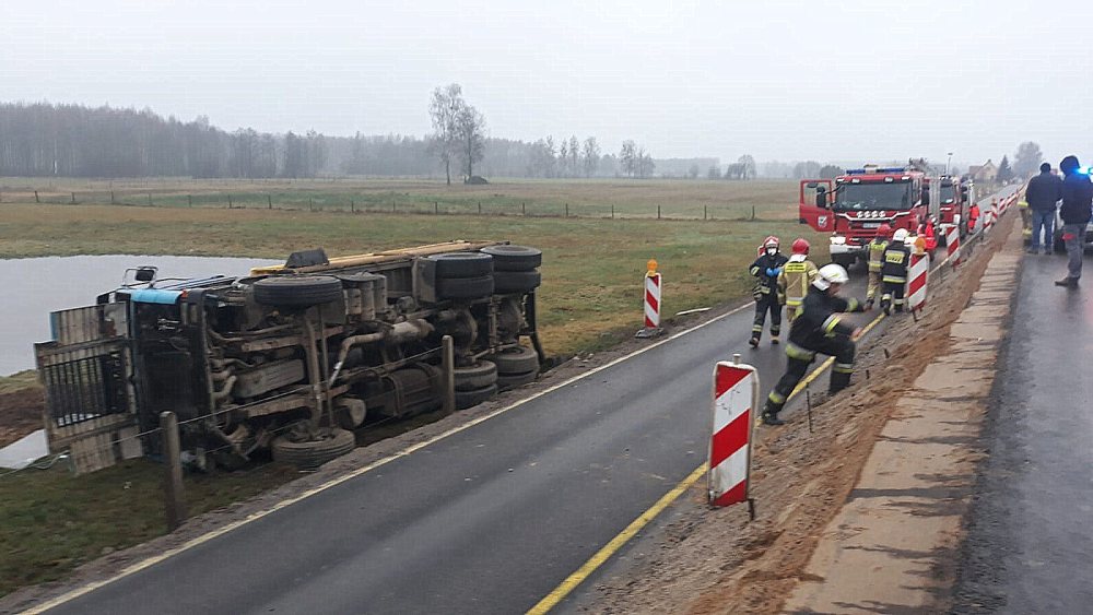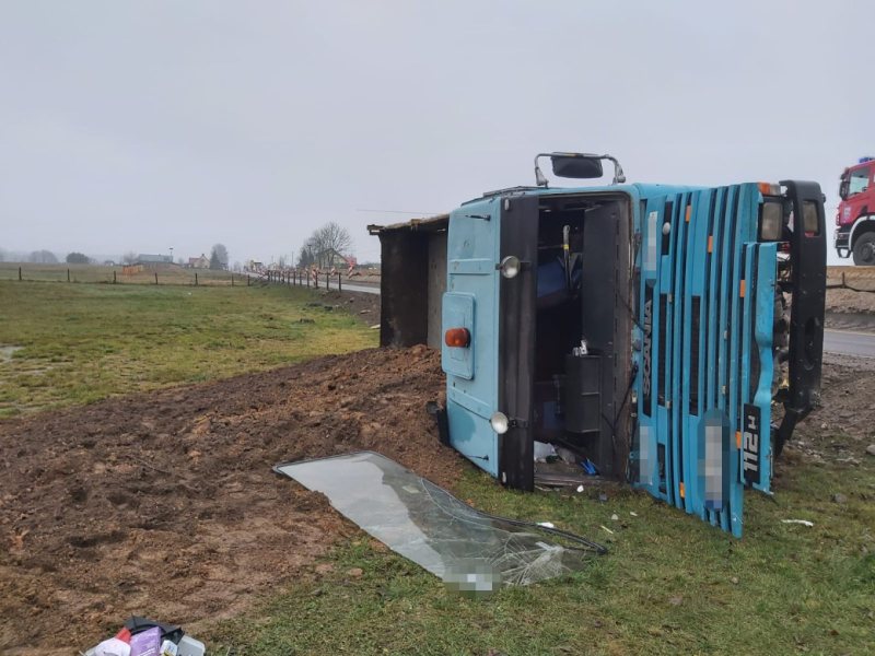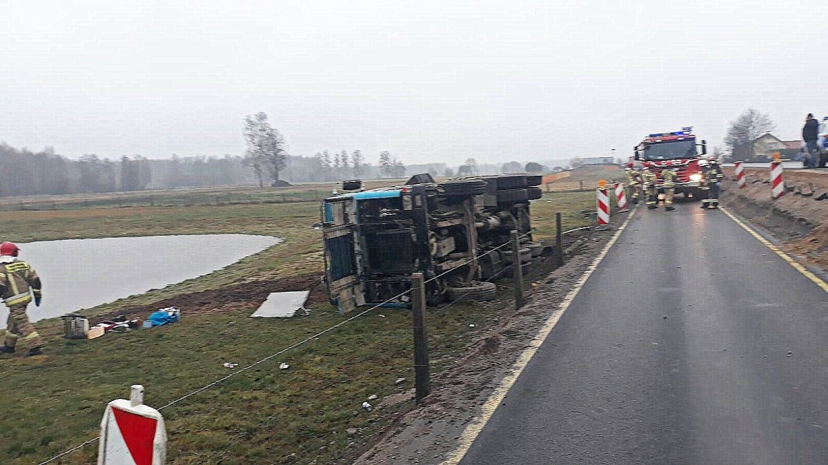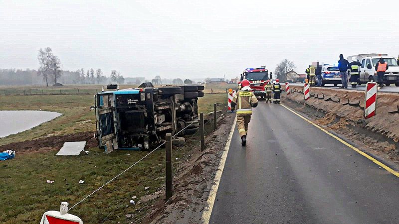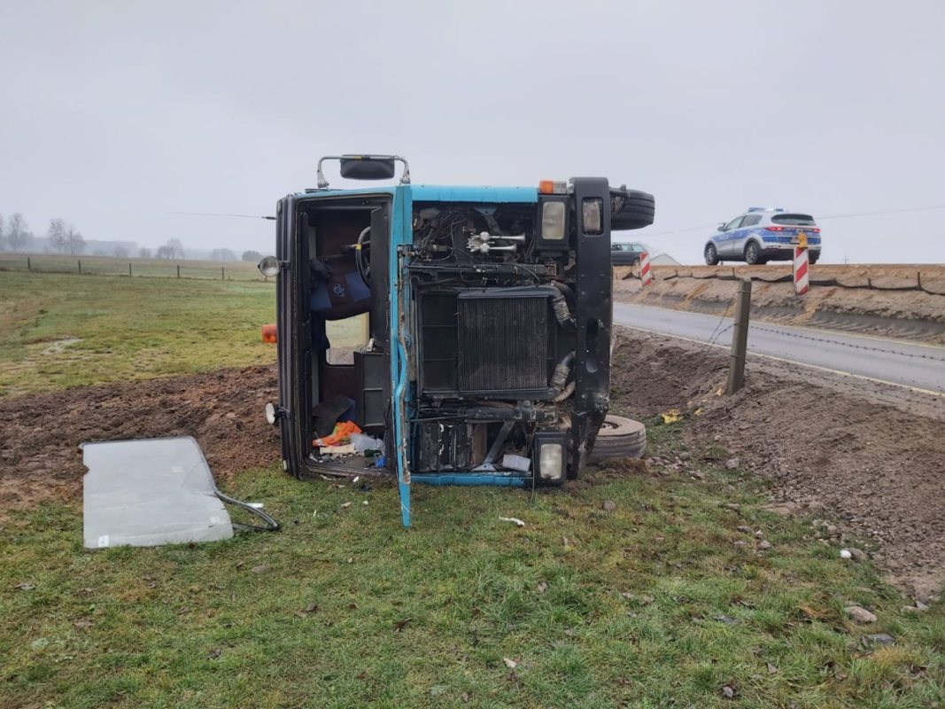 Do wypadku doszło dokładnie na przebudowywanym odcinku drogi Rozogi – Dąbrowy. 51-letni kierowca z województwa opolskiego stracił panowanie nad autem i zjechał na przydrożne pole. Auto przewróciło się na bok. Z naczepy rozsypał się żwir. Kierowcy udało się samodzielnie wydostać z kabiny auta. Ma nieznaczne obrażenia.