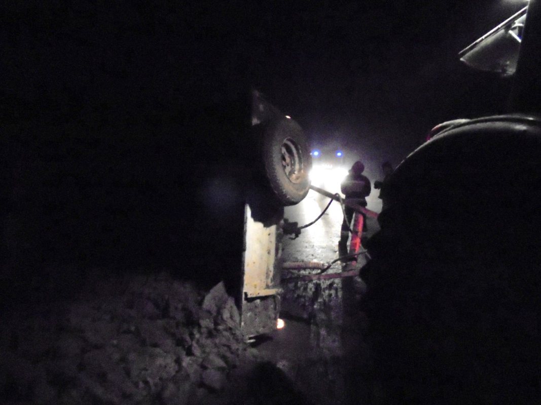 Młody kierowca „leżaka” zobaczył w ostatniej chwili. Odbił kierownicą. Cały skład wylądował w rowie. Jedna z przyczep przewróciła się. Osad wylał się do przydrożnego rowu.