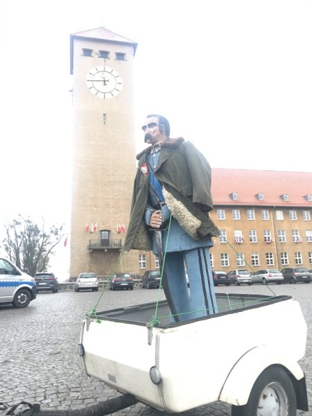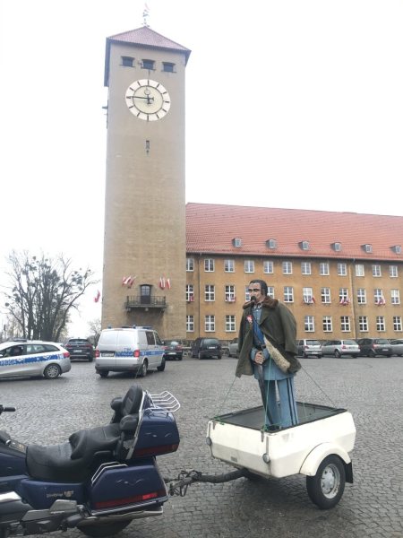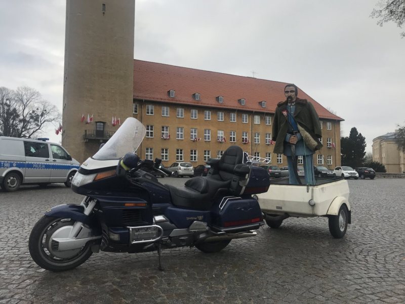 Radny na specjalnej przyczepce umieścił własnoręcznie wyrzeźbioną postać marszałka Józefa Piłsudskiego. Przyczepkę podpiął do motocykla i tak jeźdź po Szczytnie.