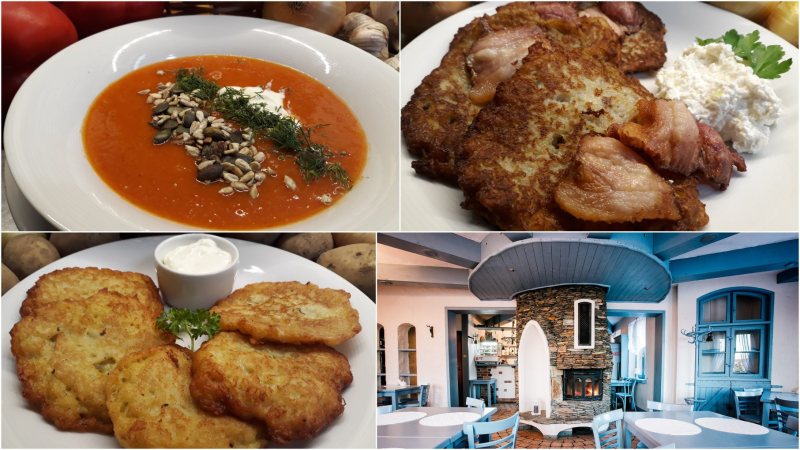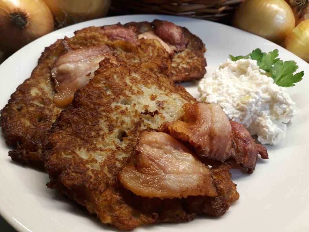 *plince z pomoćką to placki ziemniaczane przekładane podsmażaną wędzonką podane z sosem na bazie kwaśnej śmietany i twarogu z cebulą. To typowe danie kuchni mazurskiej.