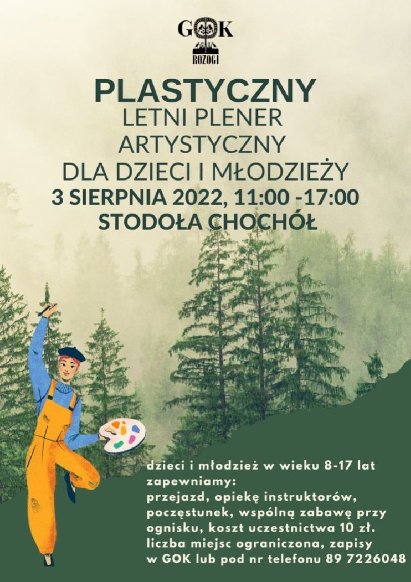 Na 3 sierpnia zaplanowano plastyczny letni plener artystyczny dla dzieci i młodzieży w wieku od 8 do 17 lat. Odbędzie się on w Stodole Chochół koło Świętajna. Zapisy i informacje pod numerem telefonu 89 722 60 48. Koszt uczestnictwa to 10 zł. Szczegóły na plakacie.