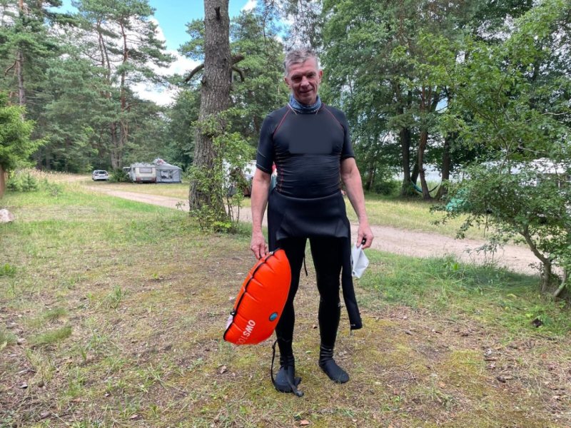 NARTY–WARCHAŁY | Jubileusze można świętować na wiele sposobów – akademicką laudacją, galą, koncertem. Profesor Waldemar Zubrzycki wybrał zupełnie inną formę. 20 lipca z okazji 35-lecia Akademii Policji w Szczytnie oraz swoich 60. urodzin, przepłynął wpław jezioro Świętajno – z Nart do Warchał i z powrotem.