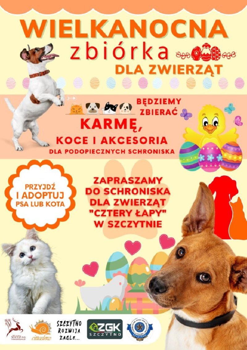 Ruszyła Wielkanocna zbiórka karmy na rzecz Schroniska „Cztery Łapy” w Szczytnie. Potrzebna jest karma, ale też koce i inne akcesoria dla czworonożnych podpieczonych schroniska – psów i kotów.