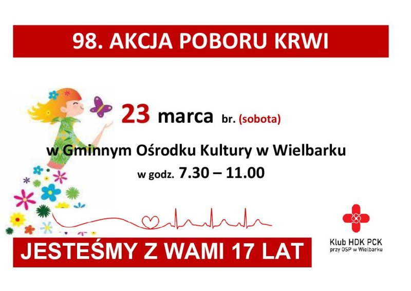 W sobotę, 23 marca, Gminny Ośrodek Kultury w Wielbarku zamieni się w miejsce, gdzie każdy może stać się bohaterem. W godzinach od 7:30 do 11:00 odbędzie się 98. Akcja Poboru Krwi organizowana przez Klub HDK PCK przy OSP w Wielbarku.