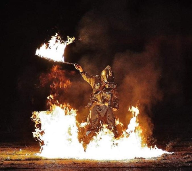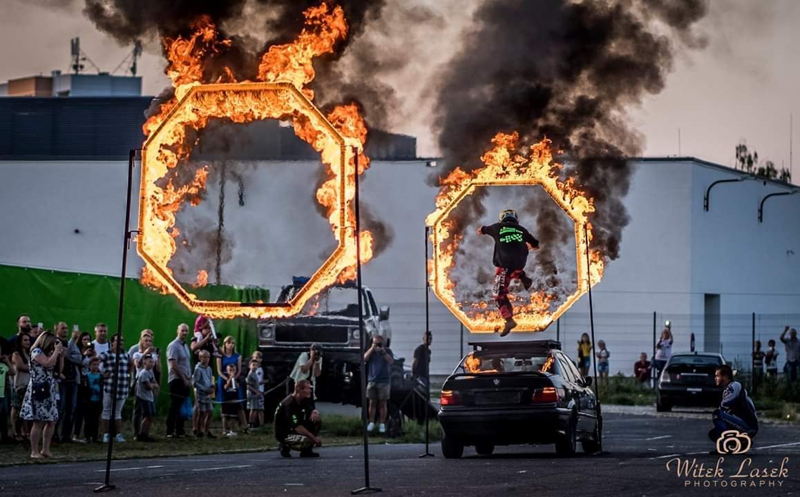 PRZEJAZDY PRZEZ ŚCIANĘ OGNIA Z CZŁOWIEKIEM NA MASCE,