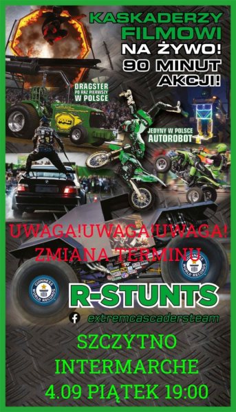Na piątek, 4 września został przeniesiony pokaz w wykonaniu kaskaderów z grupy R-STUNTS. Pierwotnie miał odbyć się w środę, 2 września. Na parkingu przy Intermache (ulica Wileńska) zaprezentują swoje umiejętności najlepsi europejscy kaskaderzy. Początek pokazów godz. 19.