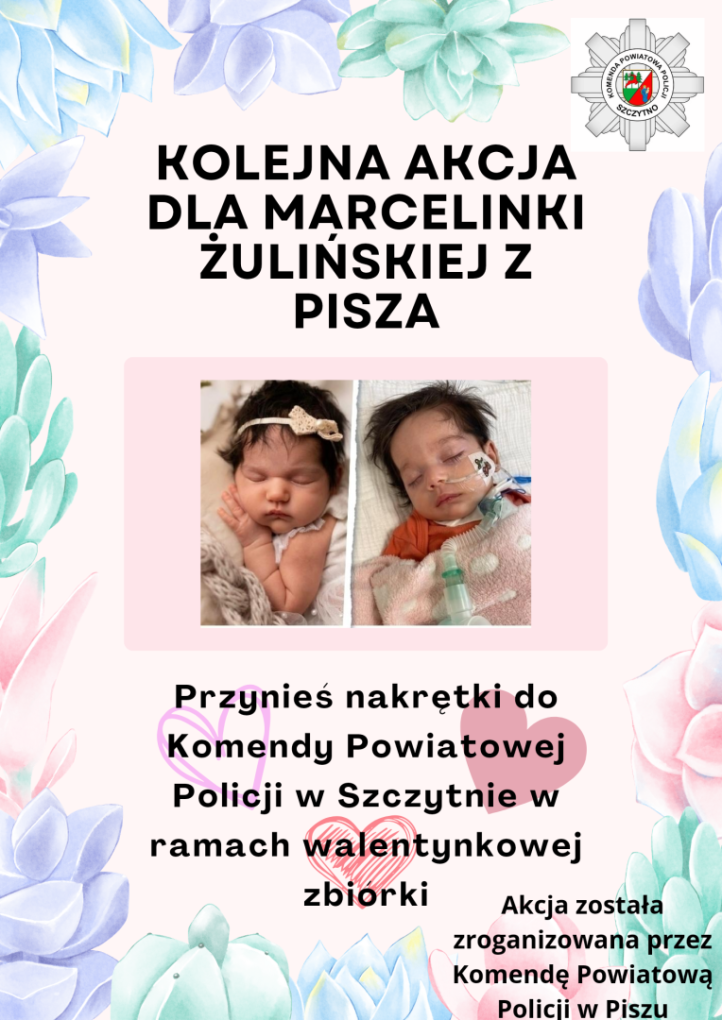 Od września 2023 roku mieszkańcy powiatu piskiego oraz Komenda Powiatowa Policji w Piszu zbierają nakrętki, aby pomóc Marcelince w powrocie do zdrowia. Policjanci i pracownicy z Komendy Powiatowej Policji w Szczytnie również dołączyli do tego przedsięwzięcia. Zachęcamy do udziału w akcji i przynoszenia nakrętek do komendy, gdzie będzie można zostawić je w wyznaczonym miejscu.
