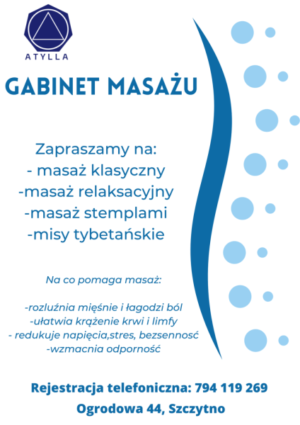 Gabinet masaży Atylla to nowe miejsce na mapie naszego miasta. Masaż jest taką rzeczą, którą się albo czuje, albo nie. Jeśli ktoś z pasją podchodzi do wiedzy na temat ciała, to od razu znajduje chory punkt. Dawid Pruszczyk zaczynał od radzenia sobie z własnymi dolegliwościami. Od masaży u kolegi do szkoły masażu, od pomagania bliskim i przyjaciołom – do gabinetu w Szczytnie. Szkolenia i rozwój w różnych sztukach masażu to stały punkt w napiętym kalendarzu właściciela Gabinetu Atylla, warto więc się przekonać, jak Dawid umiejętnie korzysta z nabytych umiejętności.