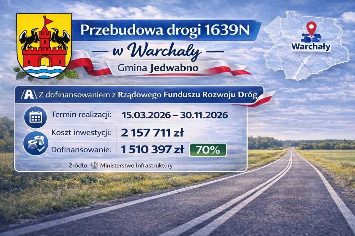 Droga między Warchałami a Brajnikami będzie dalej budowana. W 2026 roku Powiat Szczycieński we współpracy z Gminą Jedwabno kontynuuje inwestycję na tym odcinku. W grę wchodzą konkretne pieniądze i konkretne terminy.